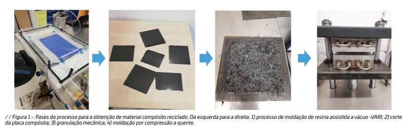 Atualmente, a tendência crescente para a incorporação de materiais reciclados, como, por exemplo, materiais compósitos de fibra longa, implica a necessidade de adaptação dos processos de composição dos materiais e dos processos produtivos respetivos, de forma a garantir a produção de componentes reciclados, com características termomecânicas compatíveis com as condições de serviço expectáveis. Desta forma, o conceito de IMC pode ser aplicado na reciclagem de materiais poliméricos, reforçados com fibras longas, traduzindo-se numa nova solução para a reciclagem de materiais compósitos, nomeadamente dos materiais constituintes dos laminados compósitos de fibra contínua.