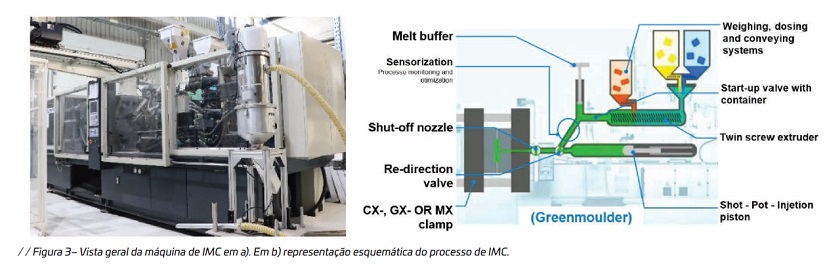 O reciclado compósito, depois de devidamente caracterizado, foi processado através da técnica de IMC. O processo de injeção e composição de material em um único processo (característico do processo de IMC) é particularmente adequado para o processamento de termoplásticos com alta percentagem de incorporação de fibras longas. De facto, o processo de IMC elimina a necessidade de fases intermediárias como a peletização da matéria-prima; etapa que reduz o comprimento das fibras; possibilitando a produção de peças com melhores propriedades mecânicas [1], sendo cerca de 40 % mais eficiente em termos energéticos do que a sequência de composição de extrusão tradicional, seguida de injeção [2]. Na Figura 3, é apresentada uma visão global da máquina IMC, disponível, no PIEP e um diagrama de alto nível do processo.