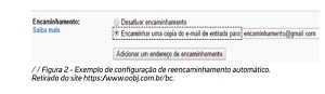 Num dos inúmeros menus, ativa o reencaminhamento automático de mensagens para um endereço de email que utiliza, por exemplo: encaminhamento@gmail.com [exemplo meramente ilustrativo].