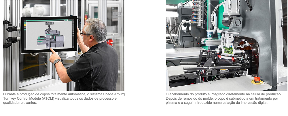 No caso da aplicação do copo, o sistema Scada Arburg Turnkey Control Module (ATCM) visualiza as funções do sistema importantes e compila os dados de processo e de qualidade para cada peça específica. Com esse fim, a máquina de injeção, a automatização e os periféricos – neste caso a impressora digital – fornecem respetivamente todos os dados relevantes ao ATCM. Desta maneira, cada copo pode ser rastreado 100%.