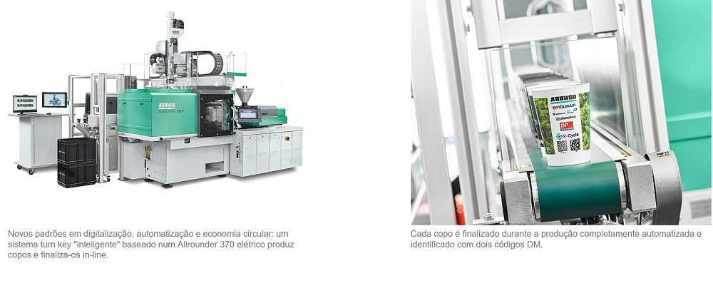 A máquina de injeção elétrica produz um copo de PP com um molde de uma cavidade com canal quente da empresa Haidlmair. O manuseamento é assumido por um novo sistema robótico vertical Multilift V 20 com uma capacidade de carga de 20 kg em estrutura transversal. Depois de removido do molde, o copo é submetido a um tratamento por plasma e a seguir introduzido numa estação de impressão digital. Assim, o acabamento do produto é integrado diretamente na célula de produção. Para imprimir o copo usa-se um tablet para escolher entre dois padrões gráficos diferentes, com texto em alemão ou inglês. Adicionalmente, cada copo é complementado com dois códigos DM – um com os dados do processo para rastreamento e o outro com as informações sobre o material para a reciclagem.